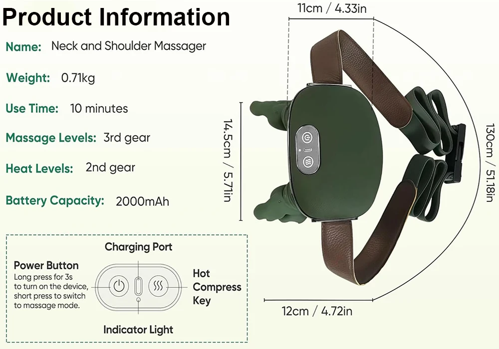 Two-Level Adjustable Soothing Heat: The bionic heated massager features a soothing heat function. Choose between low-temperature soothing or high-temperature deep penetration. The gentle warmth, combined with kneading massage, is delivered directly to the skin's deeper layers—ideal for tired necks and shoulders
